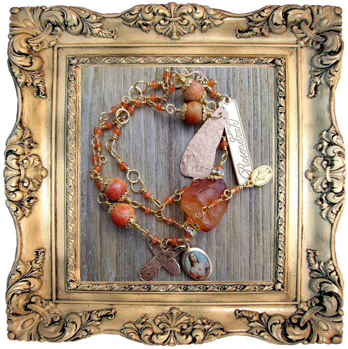 Materialien: Karneol, Apfelkoralle und Jade, handgedrehte Energie-Verbindungen aus vergoldetem Schmuckdraht, roségoldfarbene Bronze (CuSn6) , vergoldete "wundertätige Marienmedaille", vergoldetes Original-Label, vergoldete Perlkappen, Strass, emailliertes Jesusbildchen aus Fatima, rückseitig mit der portugiesischen Aufschrift: "ROGAI POR NÓS= (= Bete für uns).
