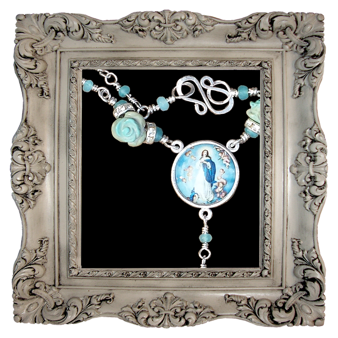 Gesegnete Rosenkranz-Halskette mit zarten, türkisblauen, facettierten Jadeperlen, Strass und handgeschnitzten Howlith- Röschen , einem Emaille- Mittelstück mit einem Abbild der von Engeln umkränzten Heiligen Mutter Maria (rückseitig ist ein Jesusbildnis eingeprägt) und einem mit Strass besetzten, silberfarbenen Kreuz. Die versilberten Verbindungen sind von Hand gefertigt und jede Verbindung ist mit heiligen Gebeten gesegnet. Zwei "wundertätige Marienmedaillen" komplettieren den Segen in dieser jugendlichen Kette. Handgearbeiteter, versilberterr S-Hakenverschluss. Länge: Ca. 62cm + ca. 14cm im Anhängerbereich. Gewicht: Ca. 25g.