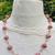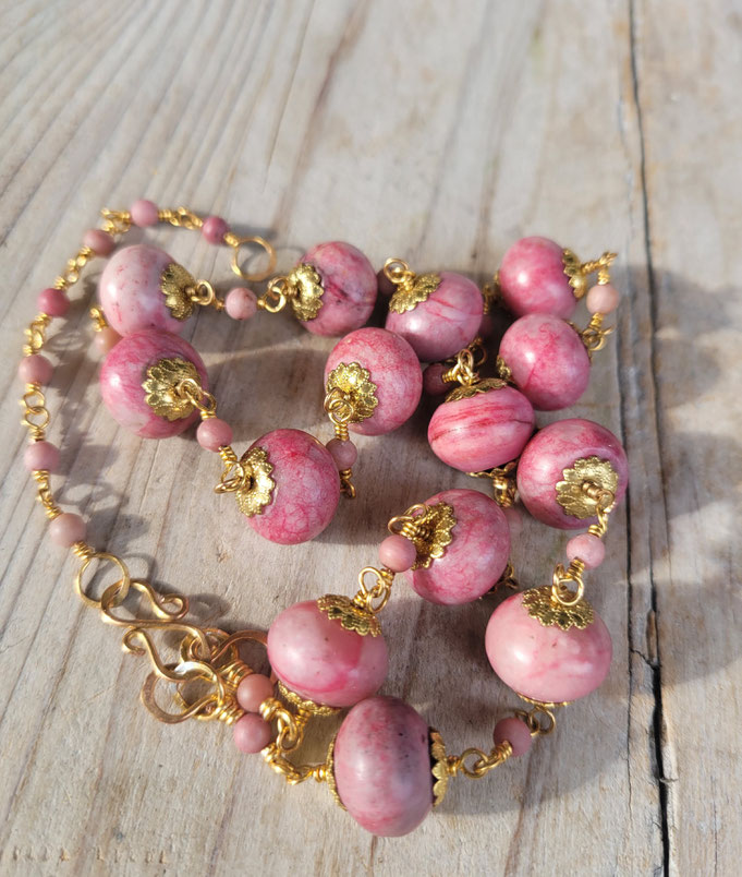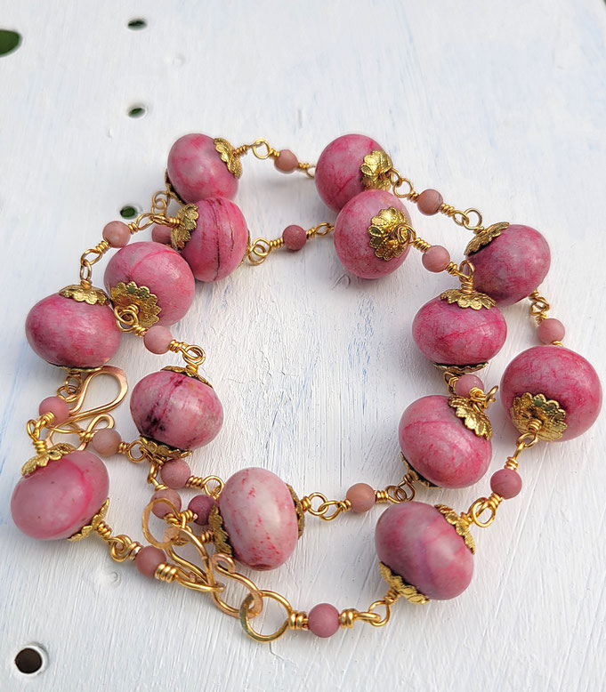 Das Collier mit den großen, seltenen Edelsteinperlen und 15 (+3) kleinen Rhodochrosit-Zwischenperlchen liegt bequem und angenehm am Hals, Verbindungen und Verschluss der Edelstein-Halskette "HERBSTSONNE" sind handgefertigt aus vergoldetem Kupfer.