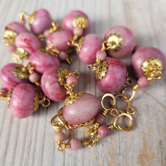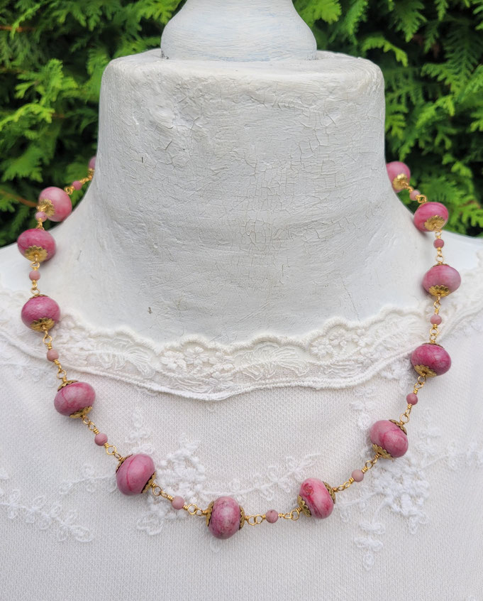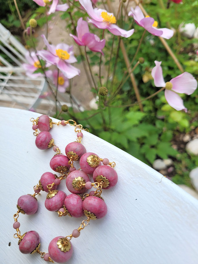 Ich habe den romantischen Halsschmuck wegen seiner wunderschönen Rosatöne nach der Herbstanemone benannt. Sie hat mich mit ihren lustigen Kugelknospen schon immer vielfältig inspiriert.