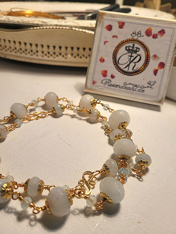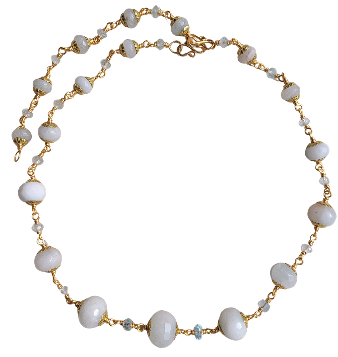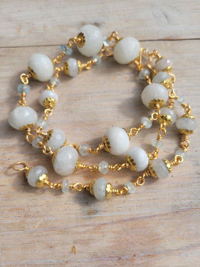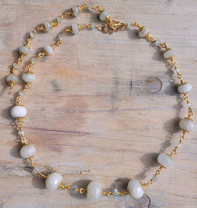 18 fein facettierte, wertvolle Aquamarine zwischen 18 himmelblauen Jadeperlen, farblich dezent und fein kombiniert zu einem eleganten Lieblingsstück für die Ewigkeit. Jede der Jadeperlen ist mit vergoldeten, verzierten Perlkappen eingefasst.
