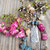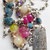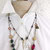 Verarbeitet habe ich hier leuchtend pinkfarbene, facettierte Jade, seltene, naturbelassene, blaue Apatite, rosa-weiß-gelb-grün farbverlaufende, facettierte Apfelbäckchenjade, gelbgrüne Serpentinjade, violette, facettierte Amethyste, weiße Süßwasserperlen und zwei kleine, blaue, antike afrikanische Handelsperlen.