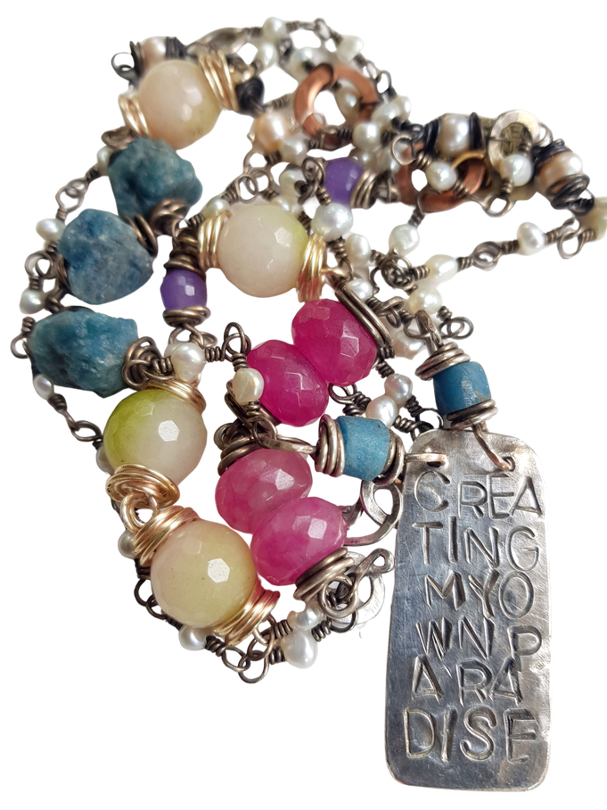 Zentraler Hingucker ist eine handgravierte Platte aus 800er Silber mit der Aufschrift "CREATING MY OWN PARADISE", die der Kette ihren Namen verleiht und der Trägerin die Energie dazu verleiht, ihr Leben selbst zu einem Paradies auf Erden zu verwandeln. Mit 10 Gramm liegt sie angenehm schwer und flach auf Haut oder Kleidung auf. Die Größe der Silberplatte beträgt ca. 4x2cm. Als Verbindung dienen 925er Sterlingsilber-Ringe und ein S-Hakenverschluss sowie rosévergoldeter und versilberter, geschwärzter Kupferdraht und gehämmerte Kupferringe.