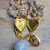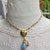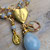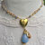 Seltener, himmelblaue Angelit und ein passender Jade-Tropfen sind hier mit einem Marien-Medaillion, einem Christus-Plakette aus Fatima (Portugal) und einer "wundertätigen", kleinen Marienmedaille zu einem variablen, vergoldeten Schmuckstück verarbeitet.