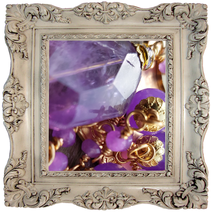 Das variable Schmuckstück, das Du hier siehst, kannst Du ebenso wie alle anderen seiner Kollektion wahlweise als Halskette oder dreifaches Armband tragen. So oder so sieht es nahezu magisch aus und ist überraschend bequem und kaum spürbar. Die Energien sind ebenso stark und strahlend, wie es die Materialien sind. Lila bzw. violett, kombiniert mit der höchsten Schwingung Gold ist einfach die Meisterklasse und wird von starken Frauen geliebt!
