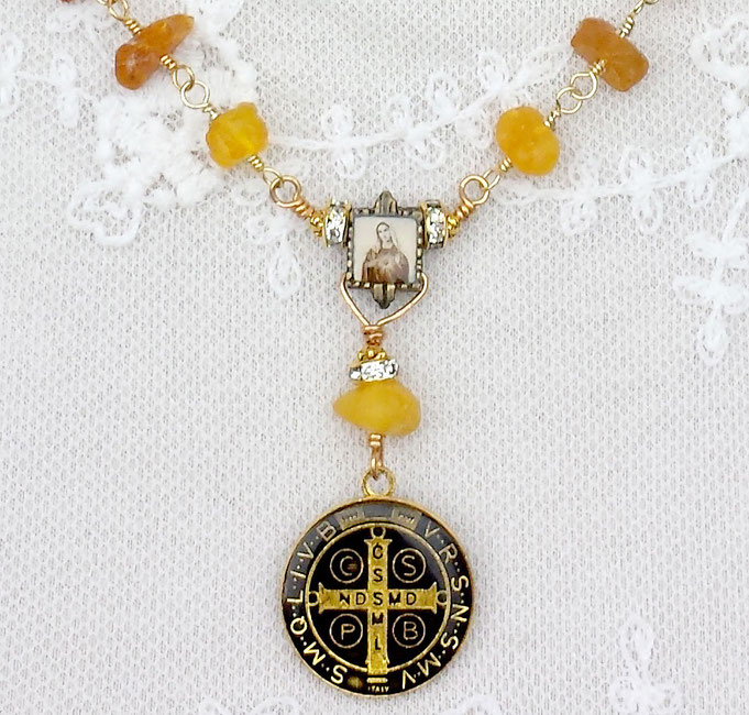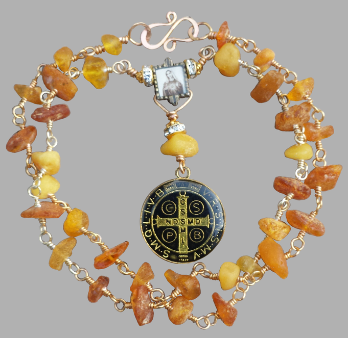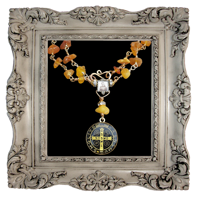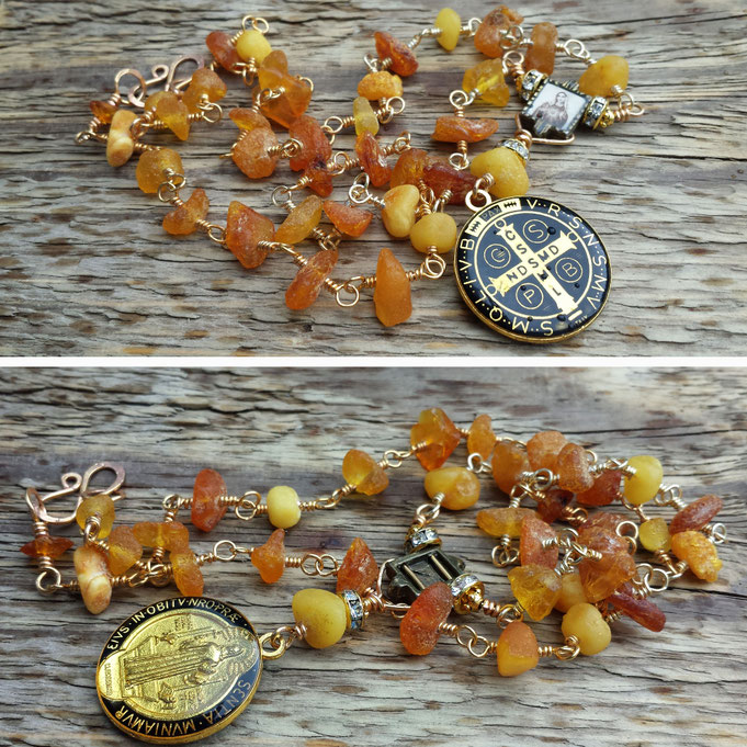 Edelsteinkette aus litauischem Bernstein mit vergoldeten Verbindungen und einem doppelseitig ausgearbeitetem Anhänger mit schützendem Benediktussegen . Im Zentrum ein hübsches Metallmedaillon mit einem Bildnis der Heiligen Mutter Maria. Handgefertigter, vergoldeter S-Hakenverschluss.