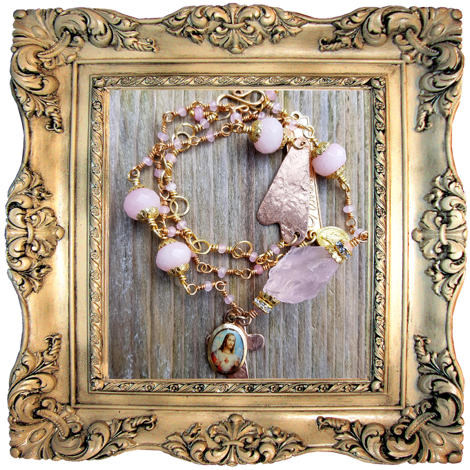 Ein großer, naturbelassener, schön rosé gefärbter Rosenquarz-Kristall ist in diesem Schmuckstück gemeinsam mit roséfarbener Jade verarbeitet. Hier treffen also Einfühlungsvermögen, Selbsterkenntnis und der spielerische Aspekt der Jade aufeinander. Zur Selbsterkenntnis gehört das Wissen, dass wir vom Allerhöchsten abstammen und hier sind, um zu lieben. Daher habe ich ein handgefertigtes Kreuzchen und ein Herz aus roségoldfarbener Bronze (CuSn6) gehämmert und eingefügt. Ein verspieltes Emaillebildchen von Jesus liegt auf dem Kreuz auf und klingelt leise und romantisch in Dein Herz!